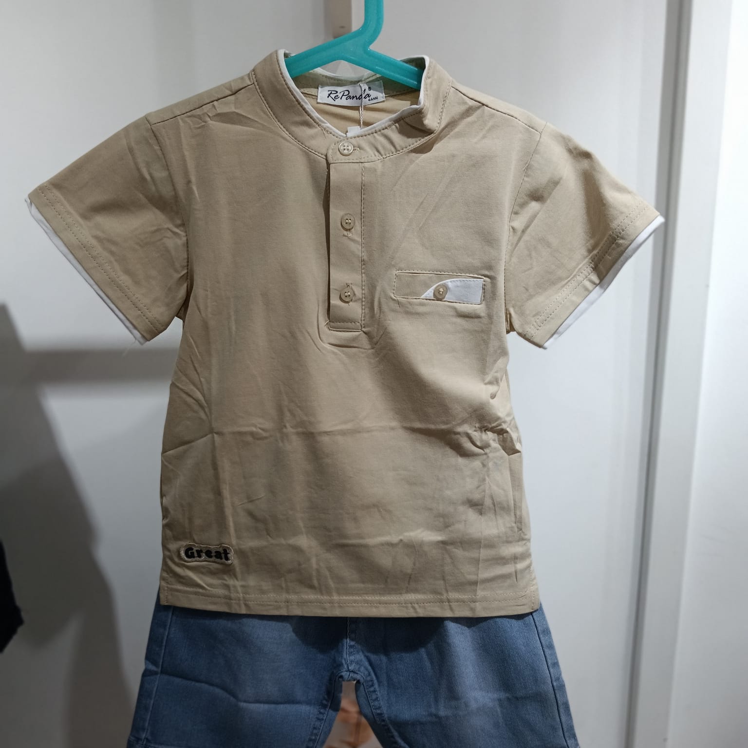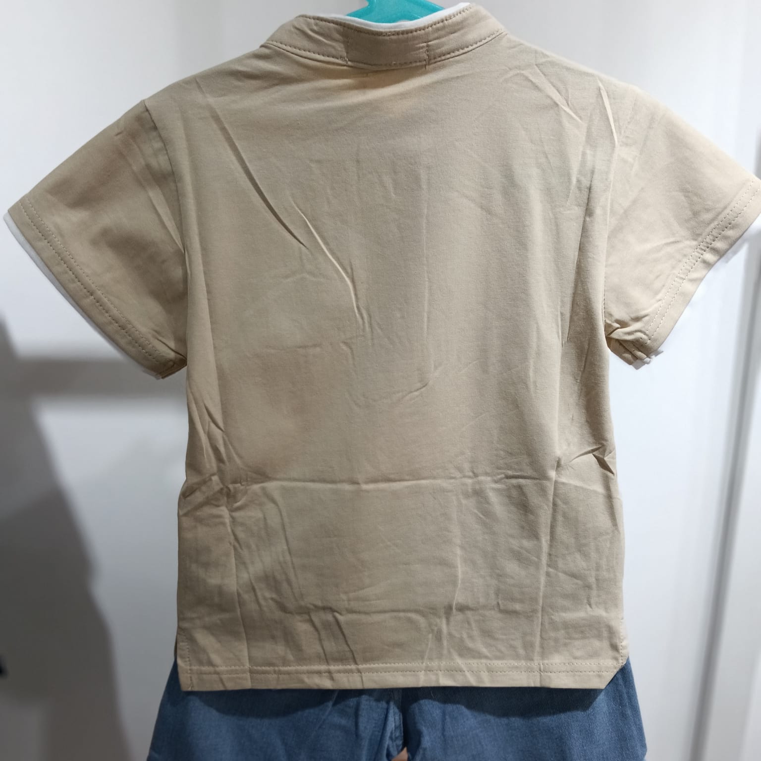 shirt beige con collo coreano, realizzata in morbido cotone 95%, avvolge la pelle con una carezza leggera, garantendo comfort e traspirabilita tutto il giorno.Il pantaloncino in jeans completa il look con un tocco casual e versatile, ideale per ogni avventura, dal parco giochi alle giornate in famiglia. Nomadino e uno stile che unisce praticita e carattere, pensato per chi non si ferma mai.Per piccoli esploratori con un cuore grande e occhi curiosi.