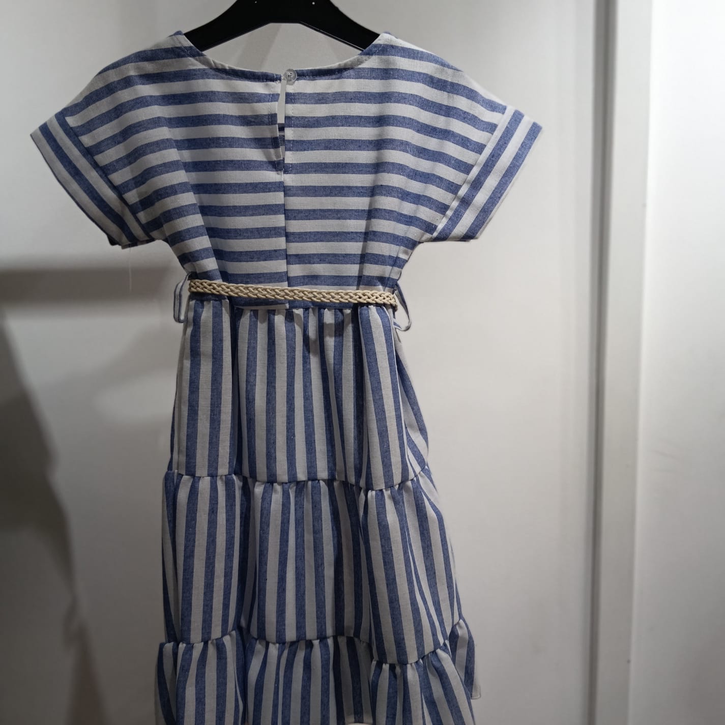Il profumo del mare, la carezza del vento.”Marinella” e un piccolo sogno d’estate, un vestitino leggero e raffinato che racconta storie di sole, barche ormeggiate e passeggiate vista mare. Le sue righe celesti e bianche richiamano leleganza senza tempo delle coste italiane, mentre la cintura in corda intrecciata aggiunge un tocco autentico, come un dettaglio rubato al mondo dei marinai.Realizzato in cotone naturale al 95%, accarezza la pelle con morbidezza, garantendo freschezza e comfort in ogni momento. Perfetto per piccole esploratrici con il cuore elegante e lo sguardo rivolto allorizzonte.Indossarlo e come partire per una vacanza sul blu del Mediterraneo.