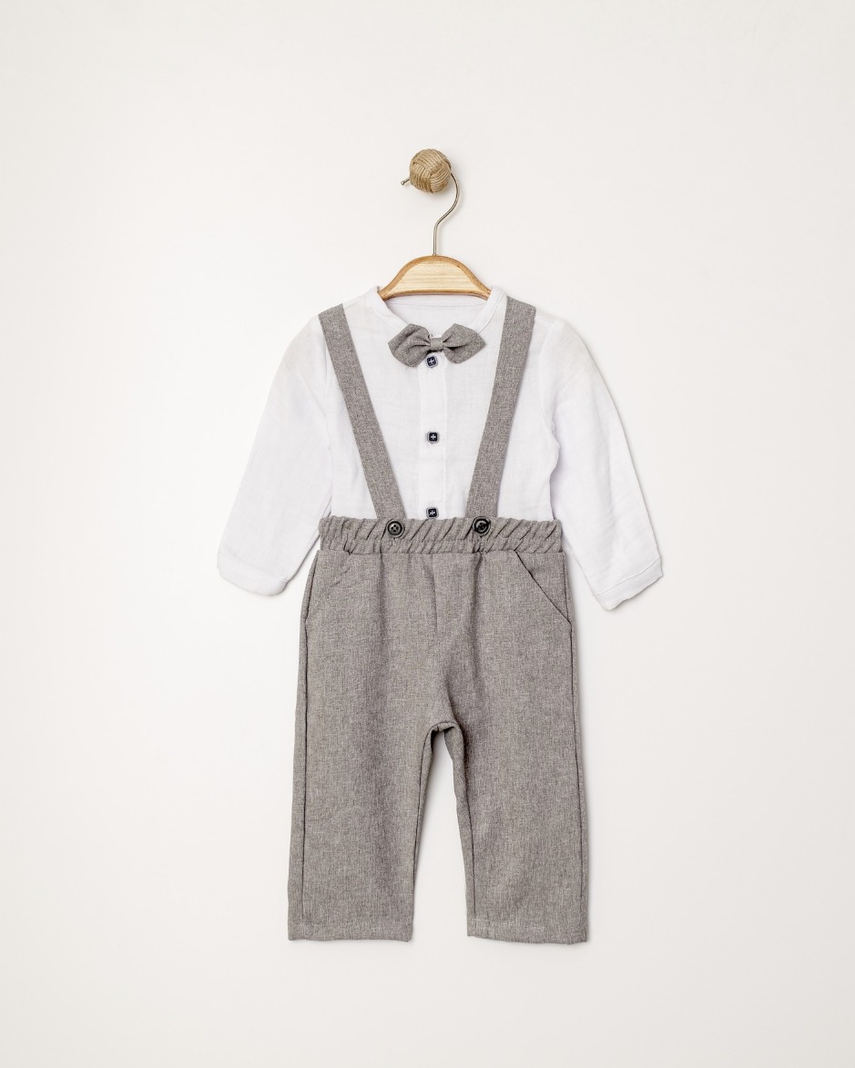 Questo completo elegante è pensato per i maschietti più raffinati, perfetto per cerimonie, battesimi o eventi importanti. Composto da una salopette grigia dal taglio classico, un papillon in tinta e una camicia bianca con bottoni quadrati che riprendono il colore della salopette, è un coordinato ricco di stile e armonia cromatica. I dettagli fanno la differenza: i bottoni geometrici aggiungono un tocco moderno, mentre la combinazione di colori neutri lo rende elegante e versatile. Realizzato con tessuti morbidi e confortevoli, il completo garantisce una vestibilità perfetta e libertà nei movimenti, per far sentire ogni bambino speciale e a proprio agio.